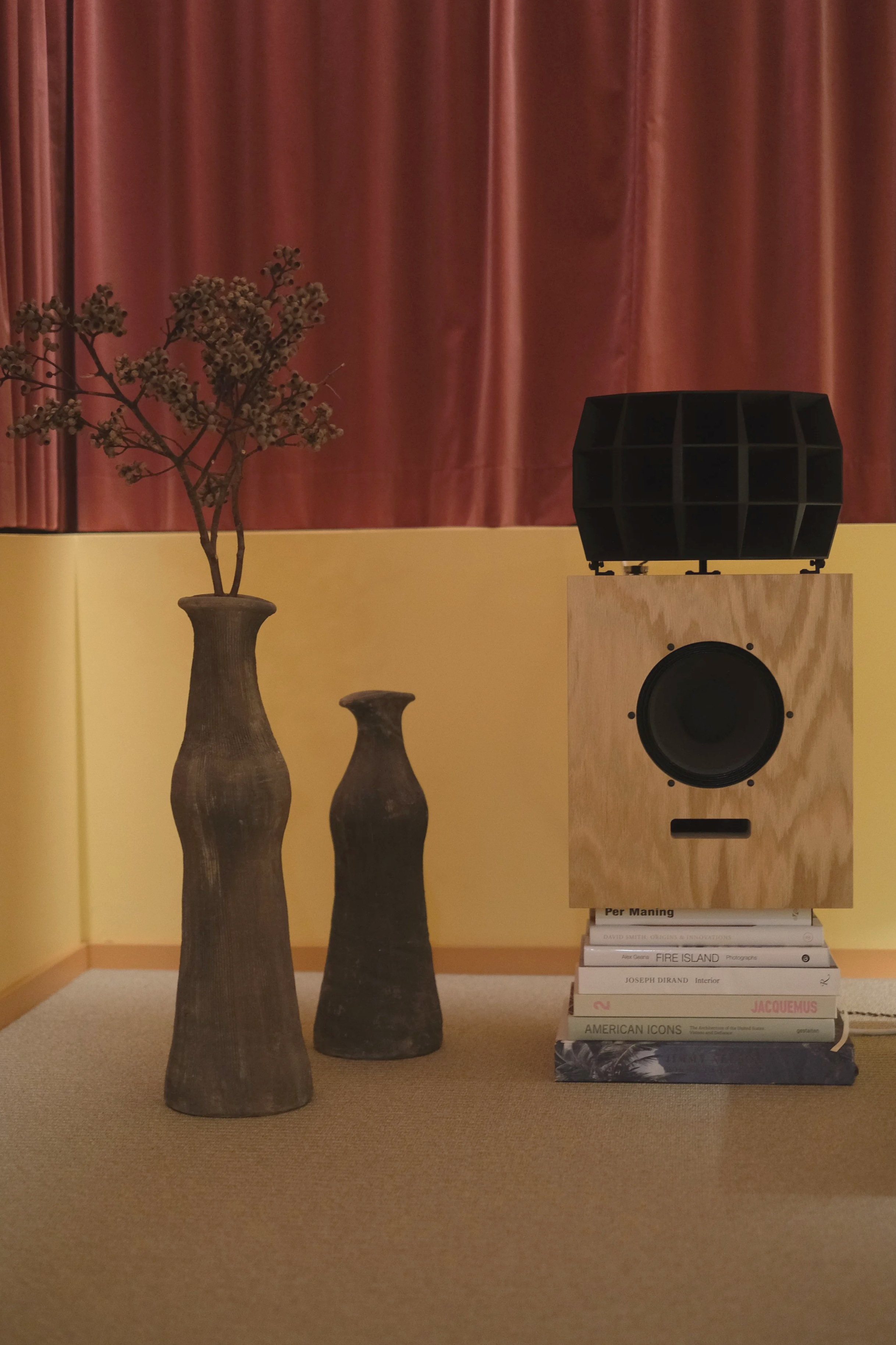 Full acoustic treatment with curtaining and carpeting, Ojas audiophile rig, and a color palette chosen for warmth and enclosure.